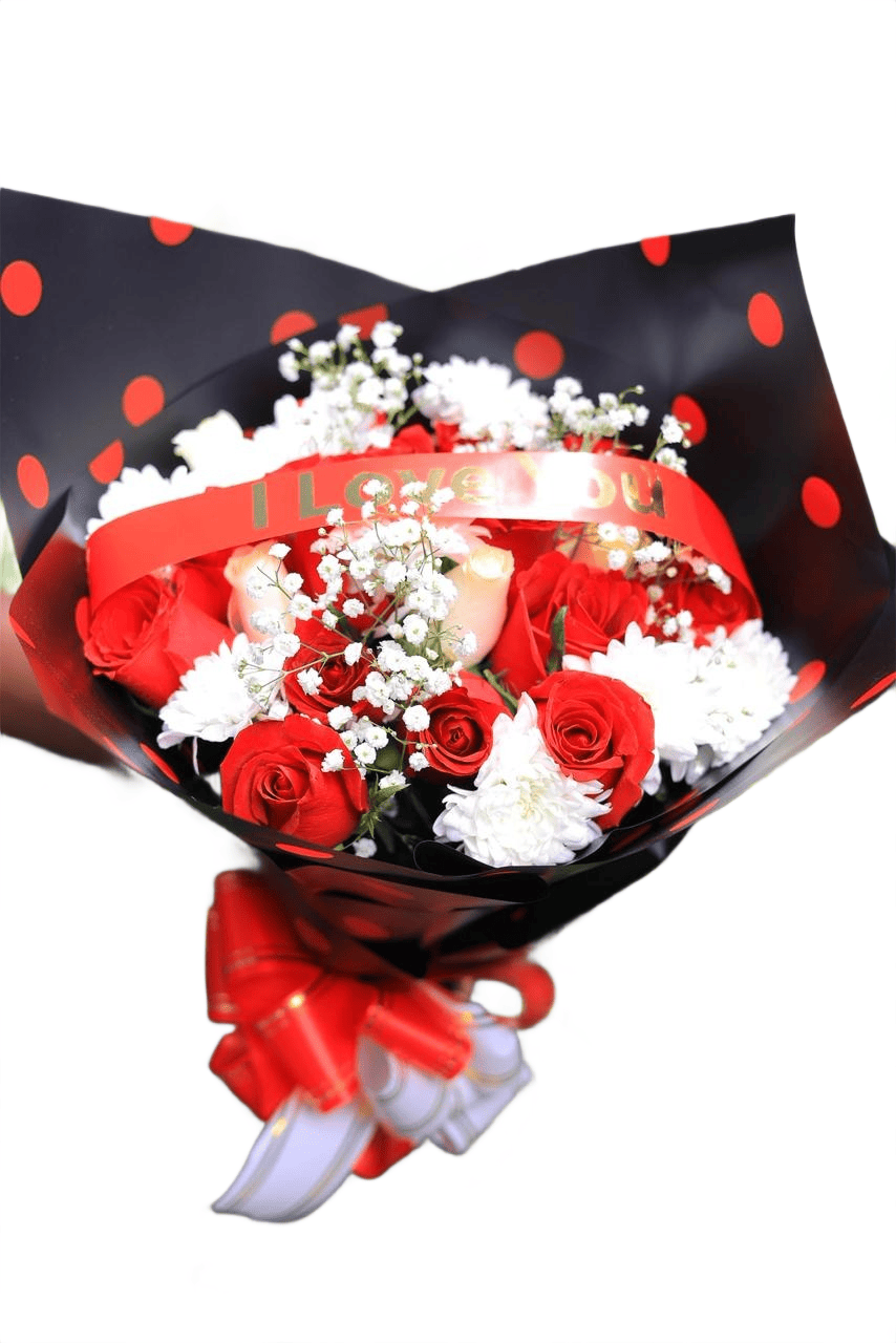 Show your love this Valentine’s Day with a stunning rose bouquet. Featuring fresh red roses, white chrysanthemums, baby’s breath, and an “I Love You” ribbon, this beautiful arrangement is the perfect gift. Order now for flower delivery in Nairobi, Kenya and make this Valentine’s Day unforgettable.